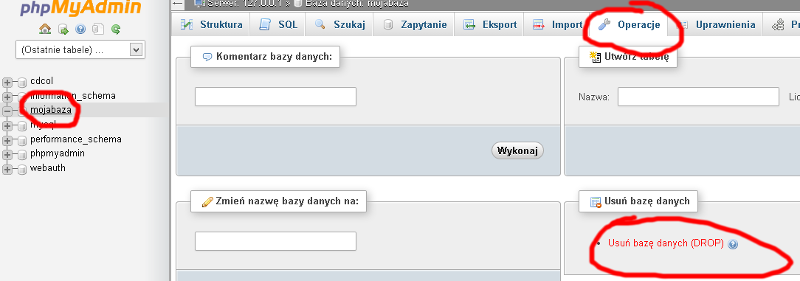 Aby usunąć bazę najpierw ją wybieramy --> później zaznaczamy zakładkę "operacje" --> i usuwamy bazę