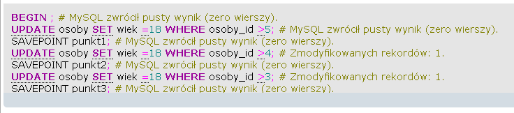 Transakcje rozpoczyna się słowem BEGIN (rozpocznij), a kończy słowem COMMIT (potwierdź).