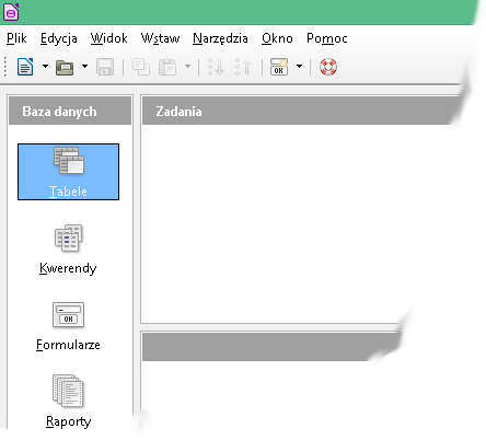 Po utworzeniu nowej pustej bazy otrzymujemy pusty interfejs użytkownika
