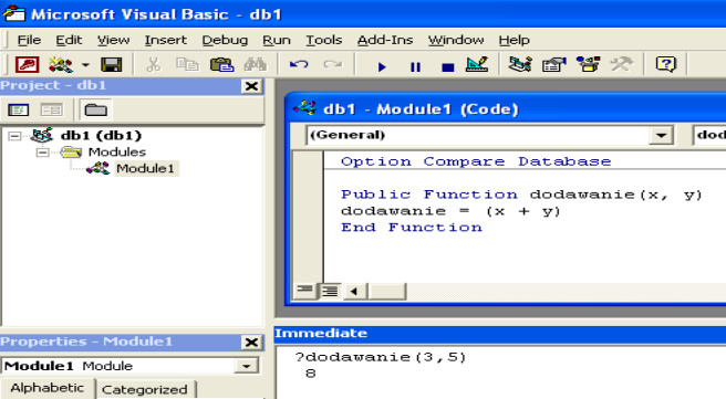 Następnie przystępujemy do programowania kodu w oknie "CODE". Po napisaniu funkcji (np. sumowania dwuch liczb) jej działanie można sprawdzić w oknie "Immediate":